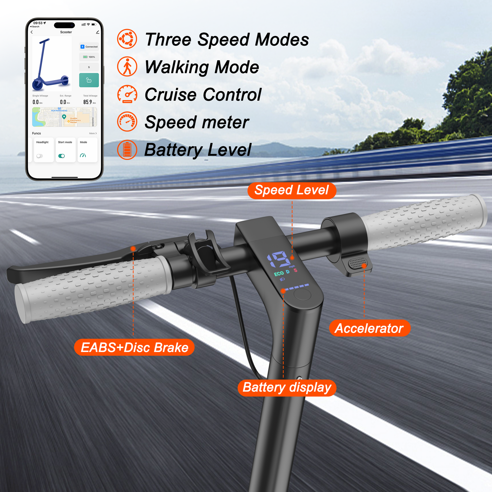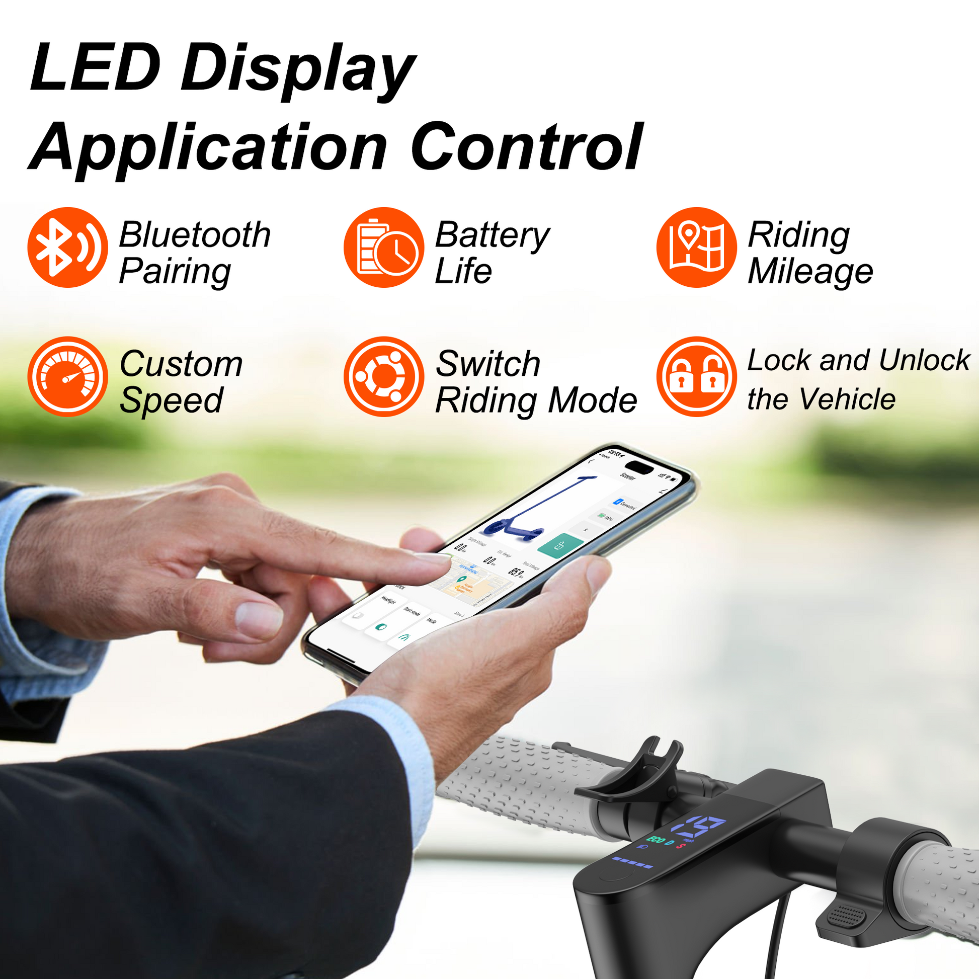 🛴【LED Display & Smart Control &Lockable】You can check your speed, modes and battery level on the LED digital display. check and control the electric scooter's features via your cell phone, such as checking cruise control, speedometer, unlocking or locking the scooter and more. It works with both iPhone and Android smartphones.